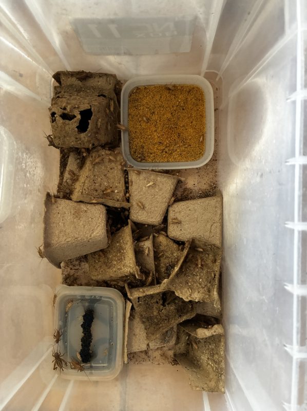 ゆりちゃんにずっと管理してもらっていたところ、産卵床は水が入りすぎていて、多分卵は全部溺死。餌のこぼれや死骸の放置、ケースに直接の霧吹きなどをしていたため、だいぶやばいのが1ケースありました。まあ仕方ない。。