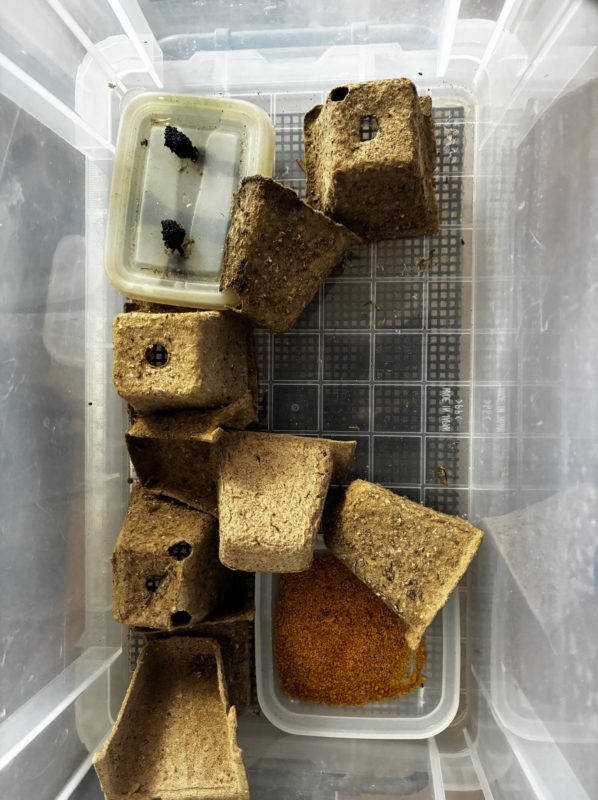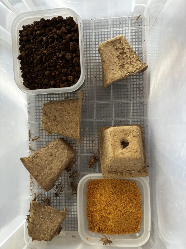 中は、一番育ち盛り。餌もたくさん食べます。普通に餌皿と水場を入れます。水場は、均のタッパーに穴を開けて紐を少し出したもの。アルコールランプみたいに紐が出ているので、中に入れた水が吸い上がってきて、そこから水分補給をしてもらいます。ヨーロッパイエコオロギは、水分足りないと死んじゃうし、水に浸かっても溺れてしんじゃうので、こういう湿った部分からちゅーちゅーしてもらうような工夫が必要。